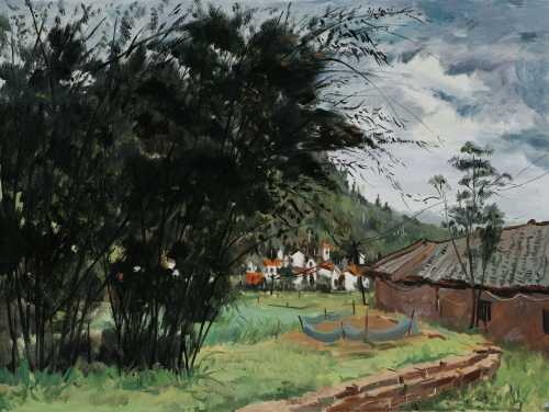 此作品是油画风景创作。在处理边缘线时试图在平面化与丰富性之间找到平衡点。表现对象是传统的自然风景,希望通过油画风景表达对音乐的感受:用指挥一场演奏般的笔触处理近处的草丛,用低音与高音般的反差来表达色彩的边缘,用架构和谐旋律的音程来丈量远近虚实,用繁而不乱的圆点编排大珠小珠落玉盘。