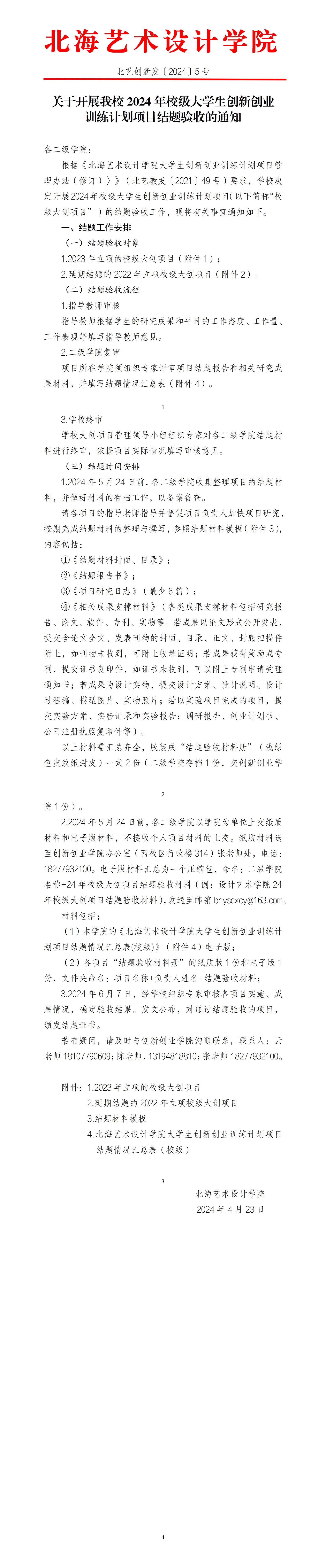 北艺创新发〔2024〕5号 关于开展我校2024年校级大学生创新创业训练计划项目结题验收的通知.rar