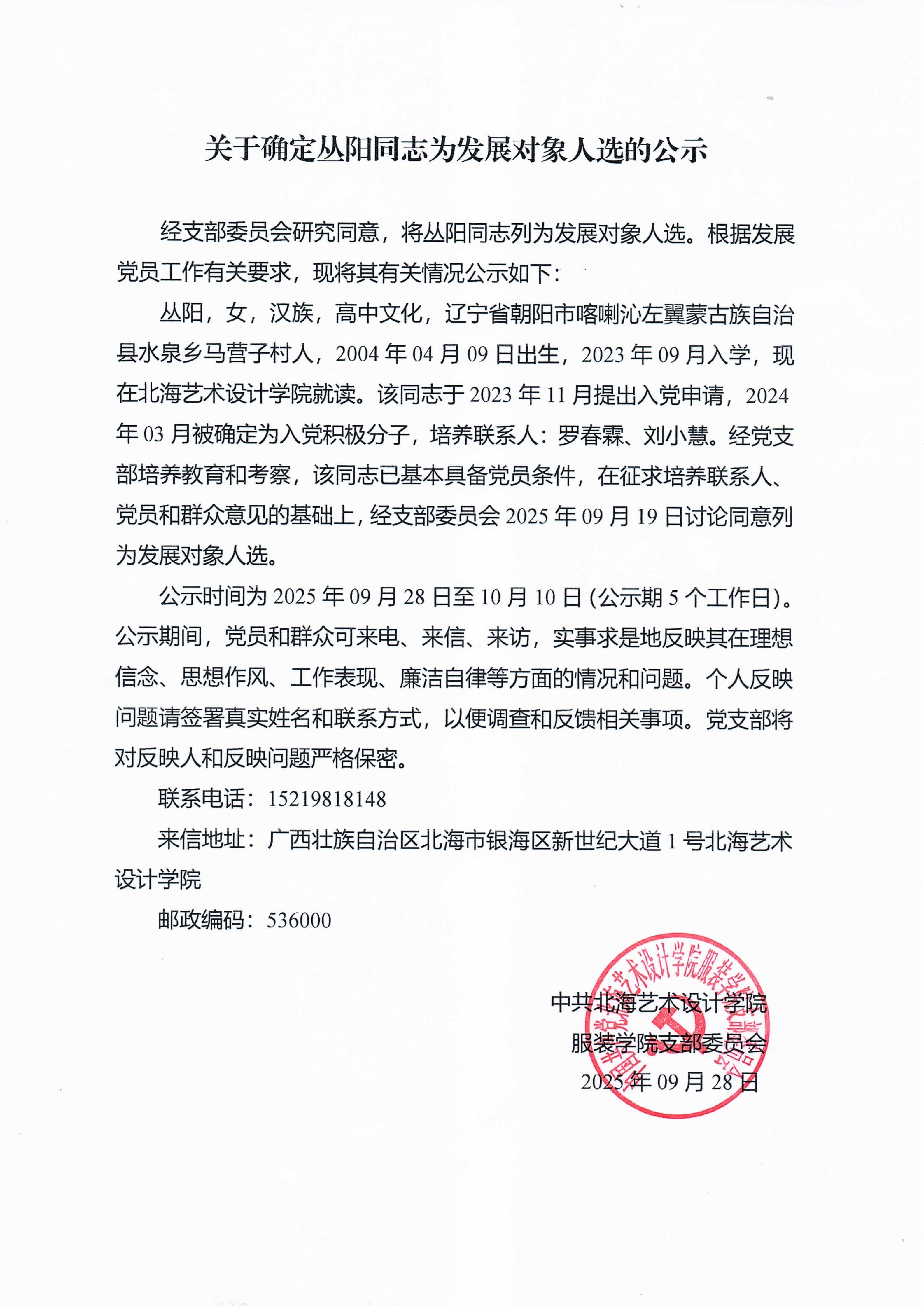 关于确定丛阳同志为发展对象人选的公示