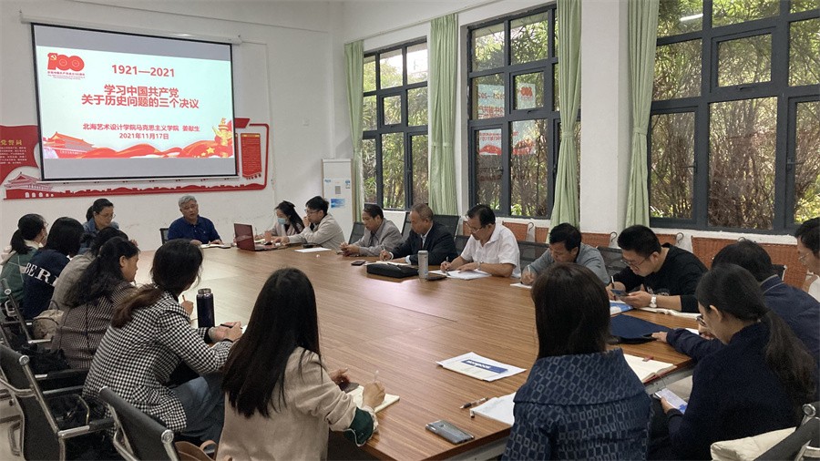 2021年11月17日,马克思主义学院全体教师在行政楼111室集中学习11月11日中共十九届六中全会通过的《中共中央关于党的百年奋斗重大成就和历史经验的决议》。学习会议由马克思主义学院院长姜献生组织。