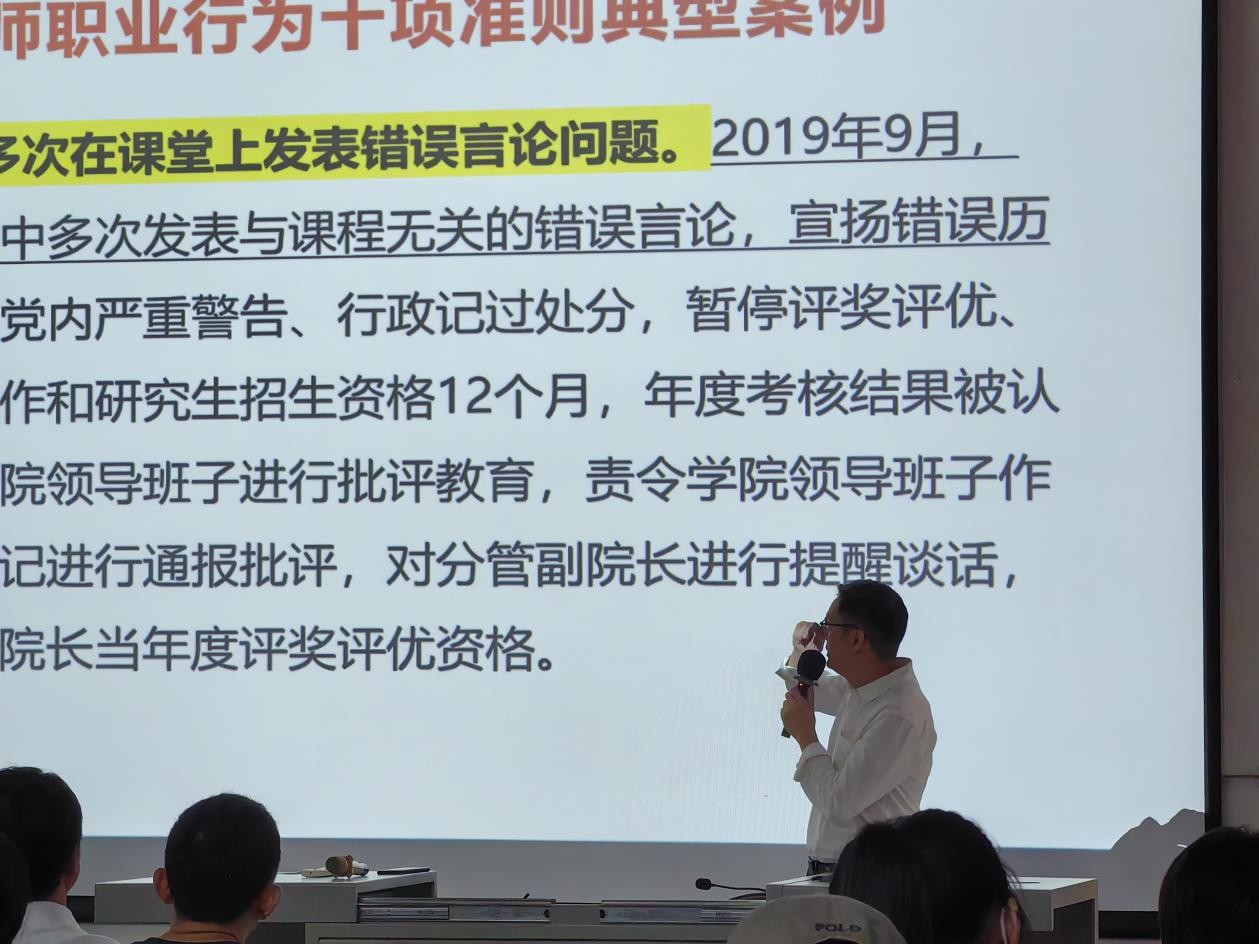 另外,庞书记还着重强调教师是教学的第一责任人,在与学生日常交流、教学等过程中应注意言论、谨慎言语用词,课堂使用图片、案例等要严谨审核,避免产生不妥当的言论行为。身为高校教育工作者要自觉提高师德修养,规范自身行为,进一步提高自身思想和觉悟,增强教书育人的使命感和责任感。(杨明/摄
