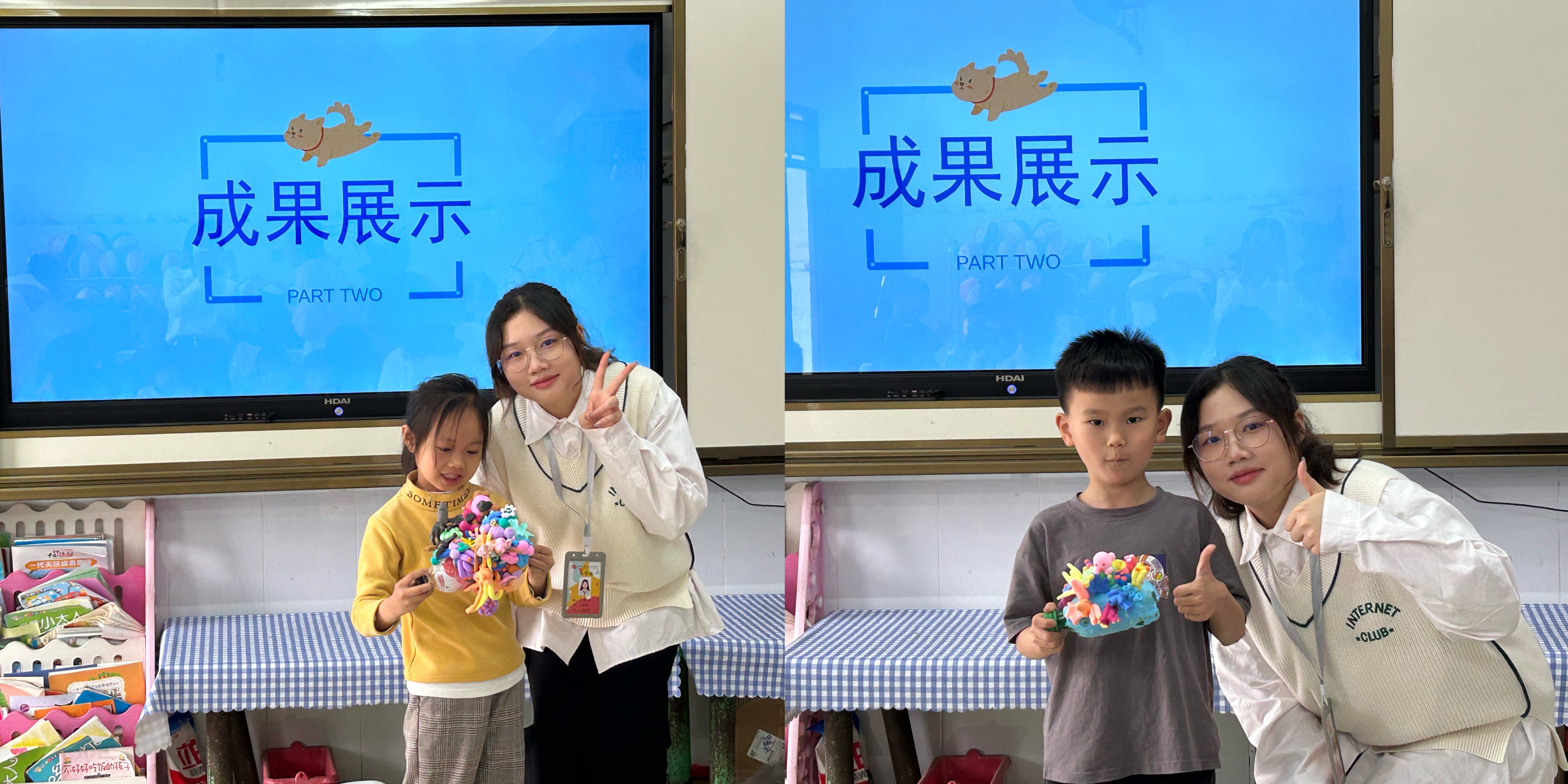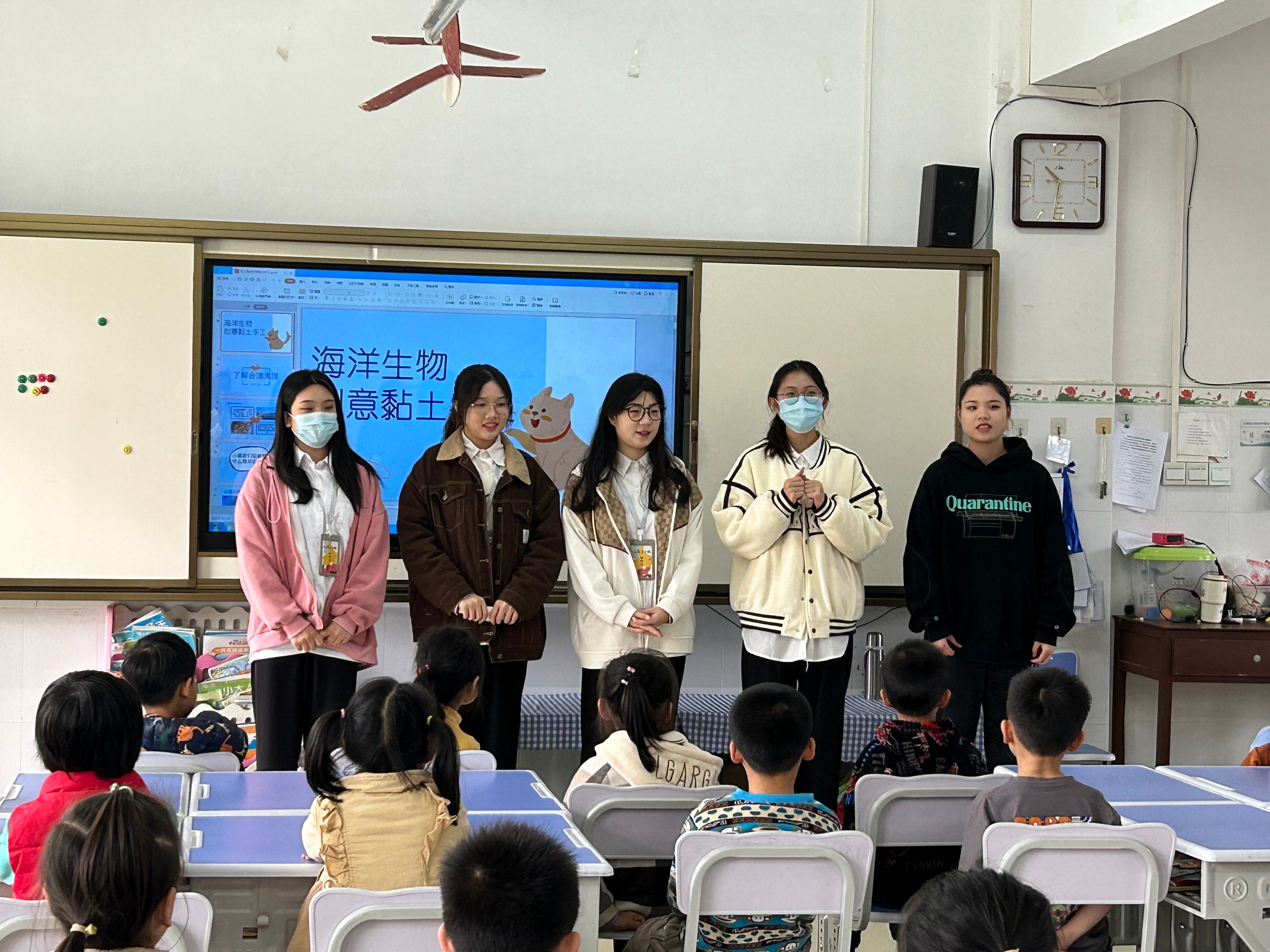 海洋生物创意黏土手工课堂上,学前教育专业的学生们引导小朋友说出自己喜欢的海洋生物,并通过生动的短视频引发孩子们对使用黏土创造海洋生物的兴趣。随后,在向小朋友们介绍相关制作过程和注意事项后,学前教育专业的学生们向小朋友分发手工黏土材料,并分组指导小朋友创造出自己喜欢的海洋生物。