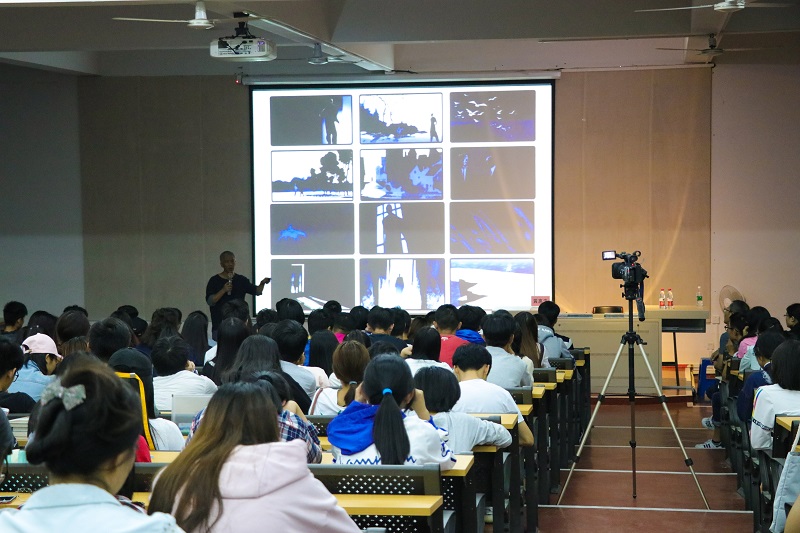接着,黄惠忠教授为同学们介绍了影片制作的首要工作――视觉开发。以合适的故事、背景、人物、色彩、构图与剪辑,到一些可能被采纳的研究方向和概念设计的全过程。同时强调同学们在影片的制作上还要注意时代的背景,研究类似的建筑物、历史环境以及山水风景这些元素,来确定它的电影语言,并借助人物推动故事情节的发展。在喜剧片与恐怖片的表现形式上,黄惠忠教授讲述了影片中的第一个镜头的重要性,以及空镜头在影片中的使用。要把握好每个节凑的转换,同时注意镜头的角度与编辑,确定影片的风格设定,在影片制作过程中要多与老师交流。