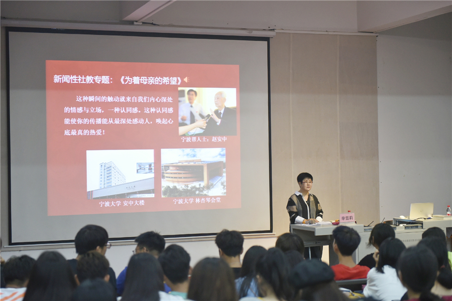 讲座开始时,辛教授与同学们分享了她近30年的工作经验和对播音主持行业的热爱,她认为播音不只是简单的传递声音,而是在广播真情、广播爱。辛教授通过从业以来的作品告诉同学们新闻背后的一些故事。作品《为着母亲的希望》、《采访罗南英的日子里》、《小丽的面人有颗心》、《跨越蓝色的梦想》、《寻找方大曾—两代记者穿越时空的对话》流露出对家乡的深情和对社会的热爱。反映出新闻不但是事件的真实,还是来自心灵的忠诚与情感的真实。