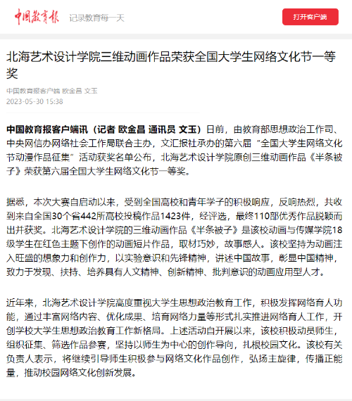 中国教育报:北海艺术设计学院三维动画作品荣获全国大学生网络文化节一等奖