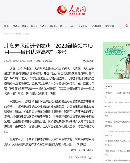 人民网:北海艺术设计学院获“2023绿植领养项目——省份优秀高校”称号