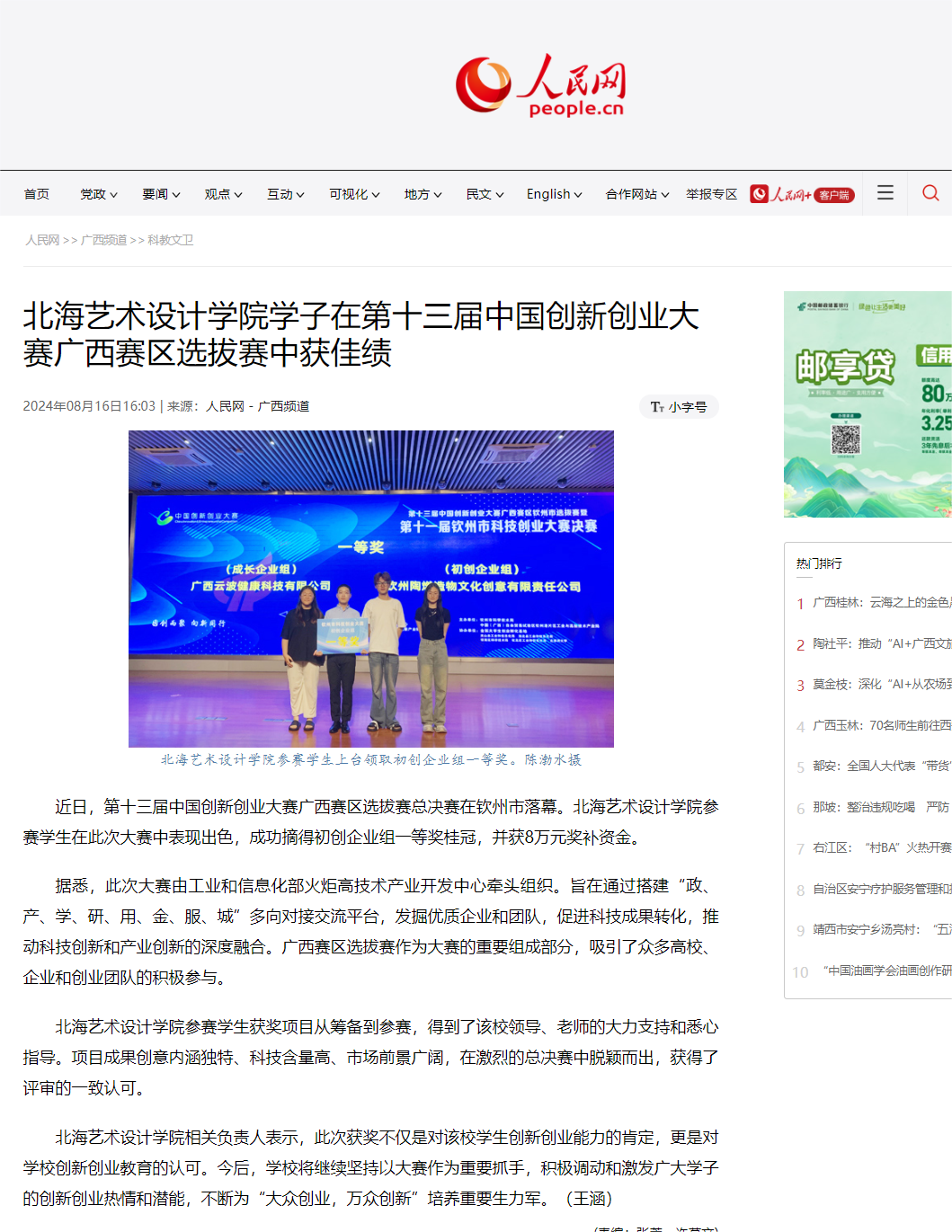 人民网:北海艺术设计学院学子在第十三届中国创新创业大赛广西赛区选拔赛中获佳绩