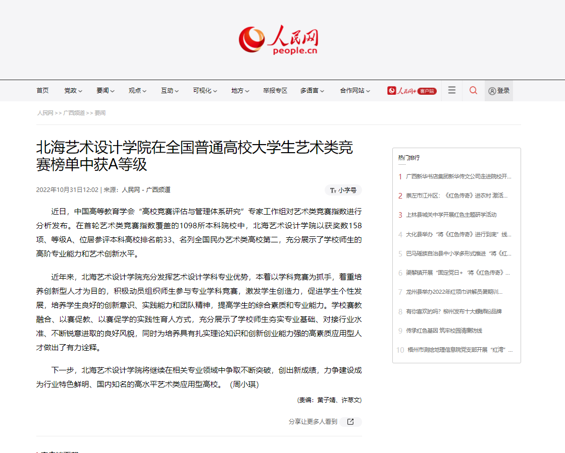 人民网:北海艺术设计学院在全国普通高校大学生艺术类竞赛榜单中获A等级
