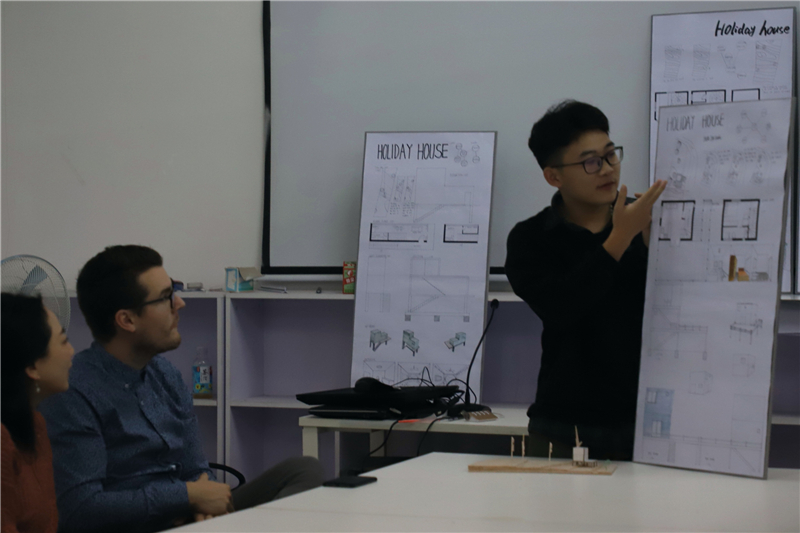 国际班的罗慧婷同学率先进行作品《HOLIDAY HOUSE》的展示汇报。接下来温瑞秋、常奇明、霍晋东、仲彤、琚司蒙、曾宏六位同学也依次携作品《VACATION》、《Building Eyes》、《HOLIDAY HOUSE》、《HOLIDAY HOUSE》、《Holiday House》、《An Interesting Buiing》进行了各自的展示汇报。让官微君印象深刻的是常奇名同学的作品,他在介绍自己的建筑设计方案时提到:“因为屋顶与地面平行,我的建筑是和整个森林、整个世界融为一体的,而不是那么突出显眼。我的建筑三个面都是玻璃,有着更宏大的视野,给人一种更贴近自然的感觉。”生动展现了他设计中的自然和谐气息概念。