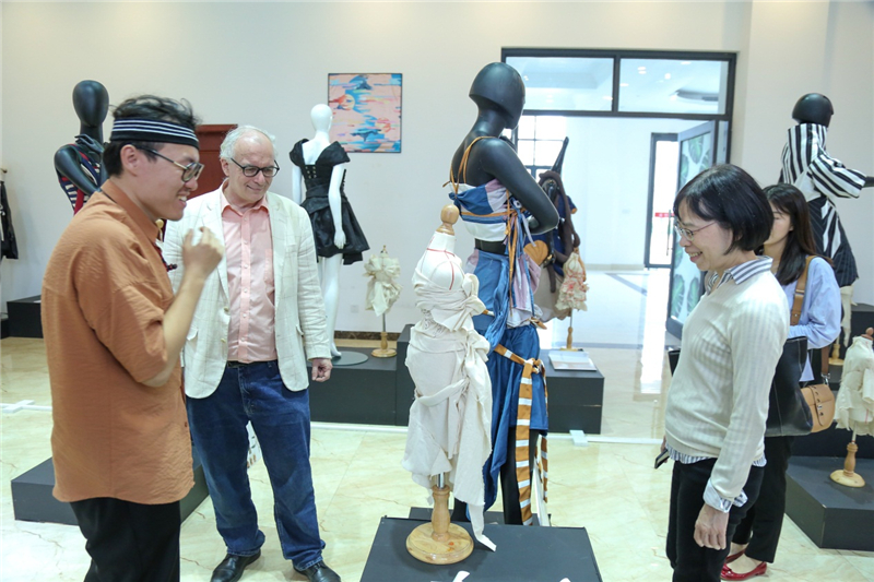(我校国际交流办公室副主任王君辰向范鲁贤社长一行讲解服装作品)