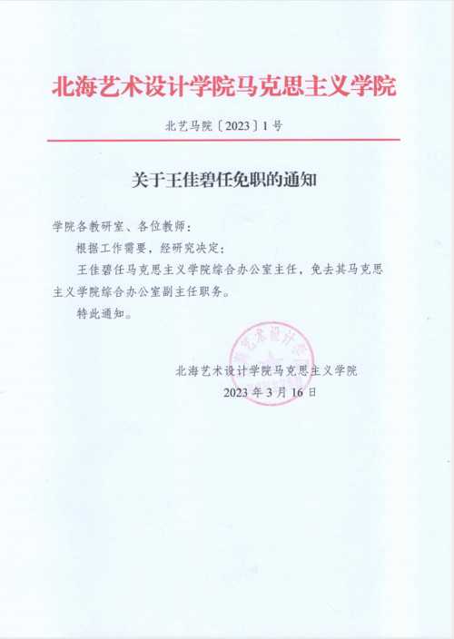 北艺马院〔2023〕1号 关于王佳碧任免职的通知