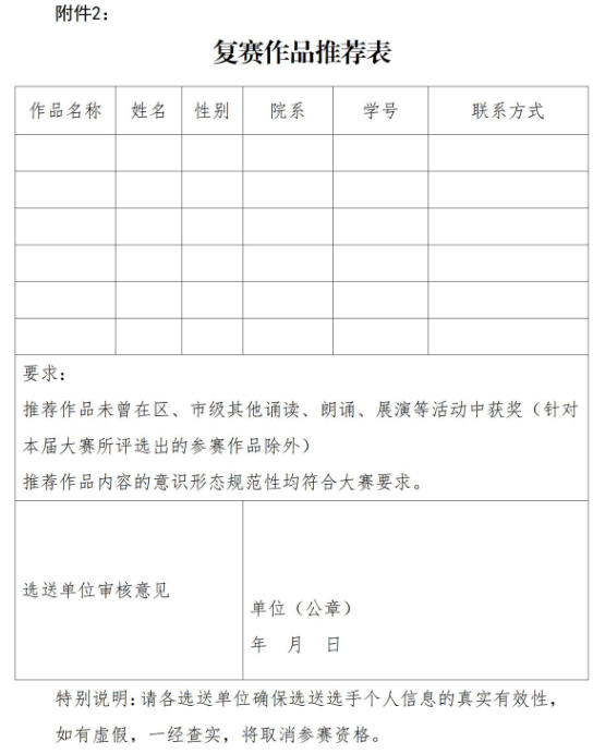 (四)参赛要求。参赛作品严禁他人代录,且参赛作品未曾在区、市级其他诵读、朗诵、展演等活动中获奖(针对本届大赛所评选出的参赛作品除外),一经发现违规,取消参赛资格。