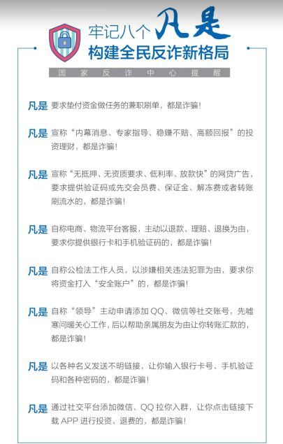 根据上级文件要求,为进一步揭露新的诈骗手法,提高老师、学生对电信网络新型违法犯罪的识别防范能力,加强学生的安全防范意识,切实保护学生免受财产及人身侵害。经研究决定,美术学院学工办将再次集中开展防诈骗宣传教育活动。活动相关事项如下: