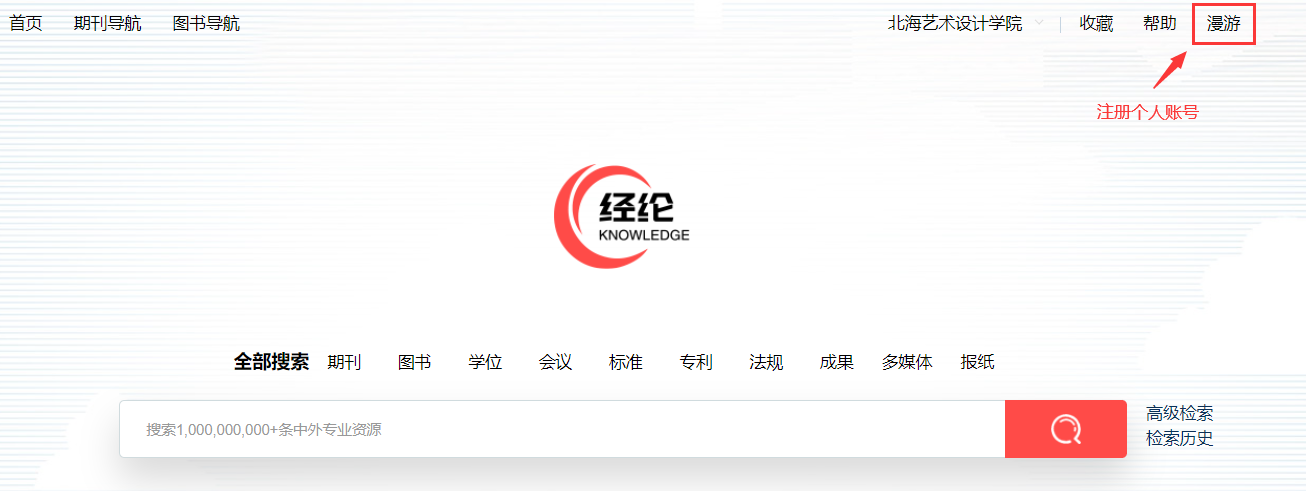 点击右上方“漫游”,进入个人账号注册流程。