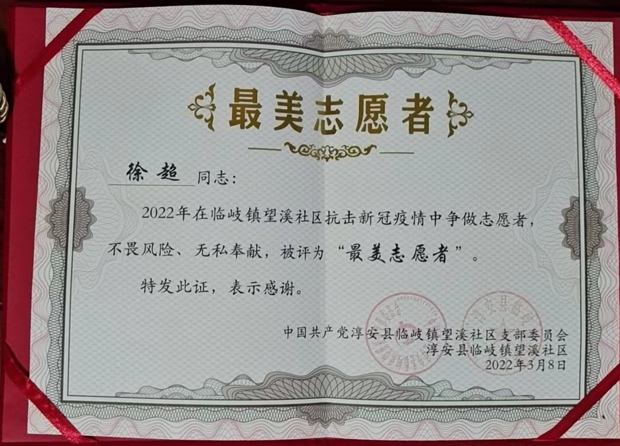 徐超同学在工作中不畏风险、无私奉献,被评为“最美志愿者”称号,用实际行动做到“服役时,忘我训练,不畏艰苦;退役后,本色不褪,勇当先锋。”