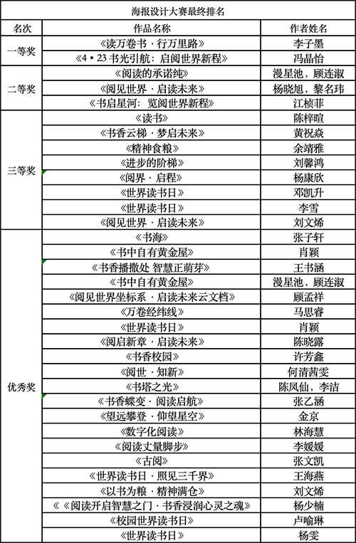 作为重头戏的“世界读书日”校园海报设计大赛首次设立纯设计与AIGC双赛道,这也为同学们的海报创作提供了新的设计思路。评审老师介绍:“参赛作品在创意表现、技术应用等方面有较高的水准,特别是AIGC赛道作品将人工智能与传统设计完美融合是一次特别的创作尝试。”经专业评审团三轮遴选,海报设计共有三十四人次获得各类奖项,获奖名单如下: