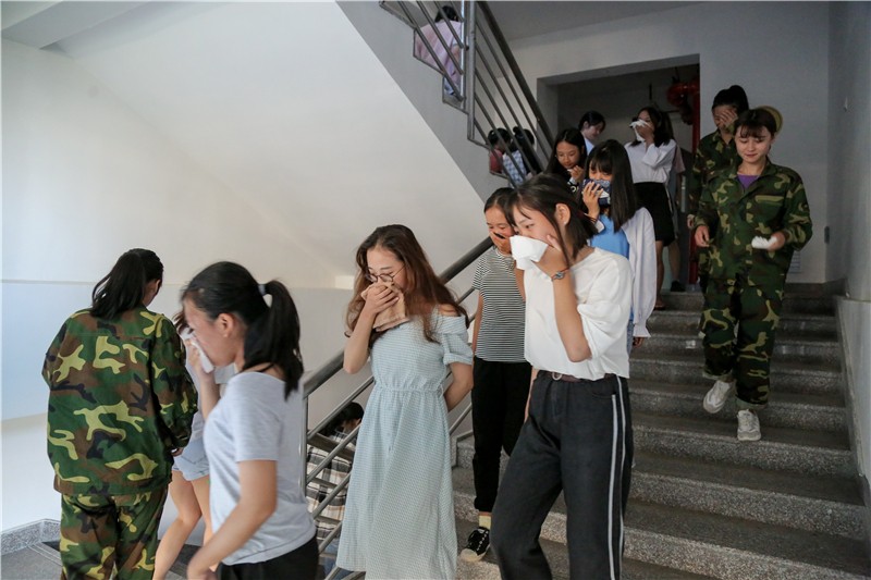下午五点整,烈日当空,消防警报拉响,宿舍楼内冒出浓烈的白烟。保安人员立即赶往现场实施疏散和救援措施,学生们从宿舍楼内快速撤离,在老师和宿管员的指导下,同学们捂紧口鼻,以较规范的逃离姿势,有秩序的撤离火场。此时,救护人员及时赶到现场搜救被困人员。整个疏散过程,各部门紧密配合,所有人员在规定时间内撤离到安全救助点。