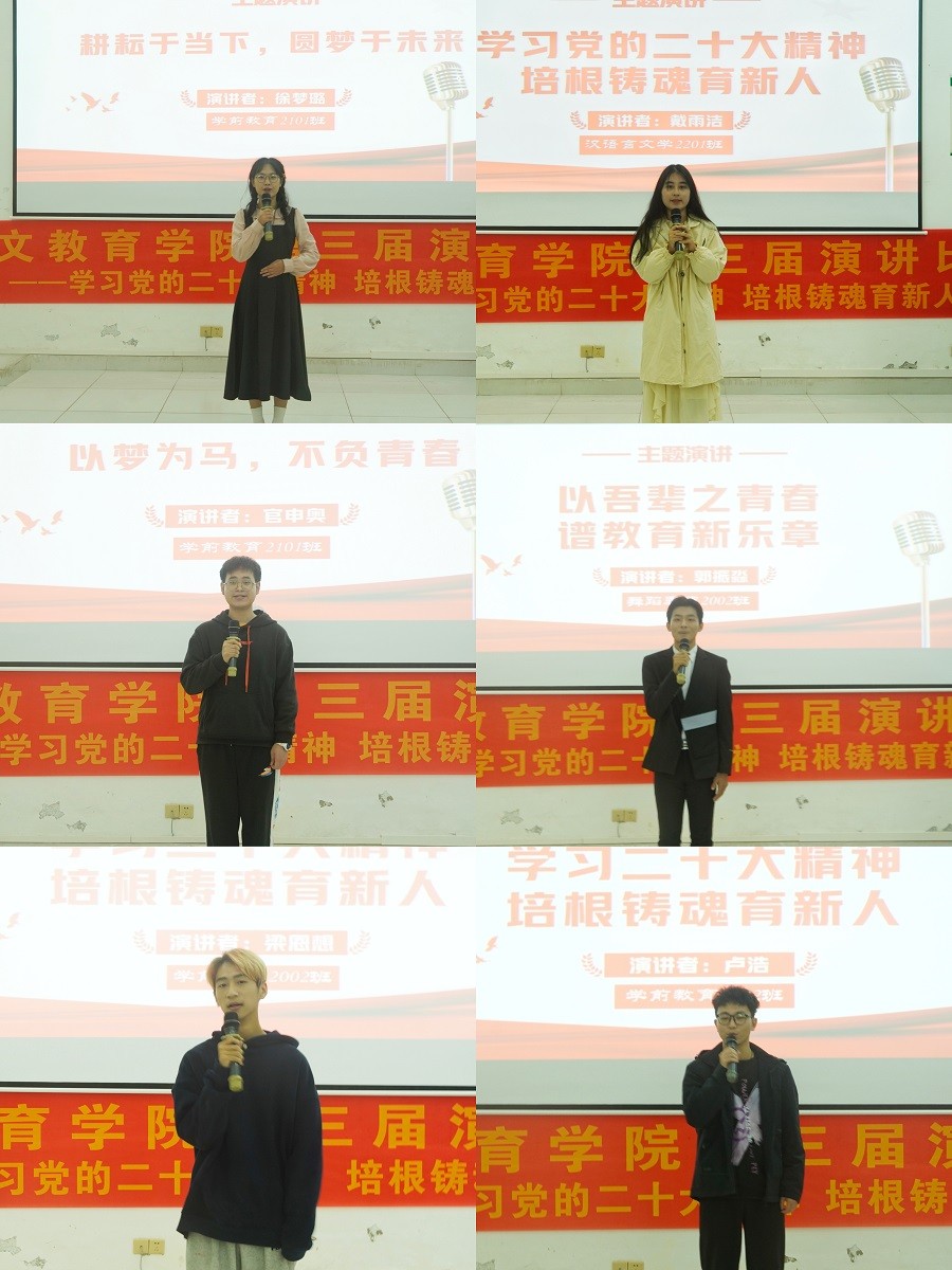 比赛第一环节为主题演讲,参赛选手们围绕演讲主题、结合自身成长经历展现了对教师这一职业的敬佩与向往之情,也分享了自己对教育的见解。选手们在演讲中表示,要从自身做起,牢记习近平总书记在党的二十大讲话中提到的“砥砺奋进三十载 培根铸魂育新人”,并呼吁广大青年学子自觉担当,以习近平新时代中国特色社会主义思想培育时代新人的伟大使命,矢志不渝听党话、跟党走。