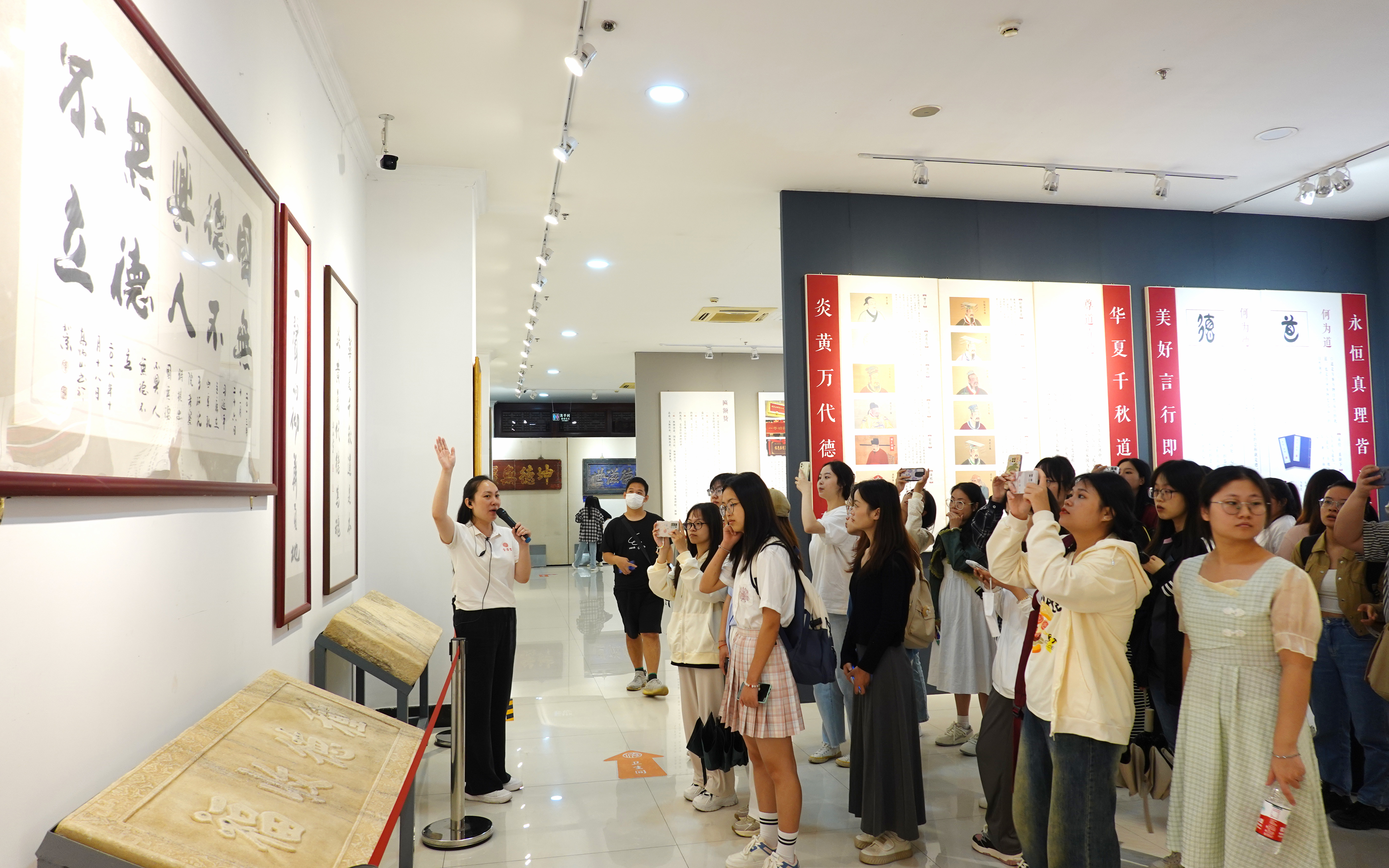 随后,博物馆的工作人员带领我院师生走进了一场历史悠久的文化盛宴。工作人员讲述崇德堂博物馆自创办以来便从全国各地征集道德文化匾额,迄今为止,匾额藏量已多达四百余块;接着又讲述了李馆长为了博物馆的发展而搜集千余幅当代书法名家道德书法作品以及200余方当代篆刻名家篆刻作品的经历;最后又带领学生欣赏了馆内500余张由夏商周至秦汉时期的蕴涵“德”子的拓片作品。这些优秀的作品都承载“道德”文化,是我国优秀传统文化精神的缩影为我院学生提供近距离感知历史文化知识、领略中国民族文化魅力佳窗口