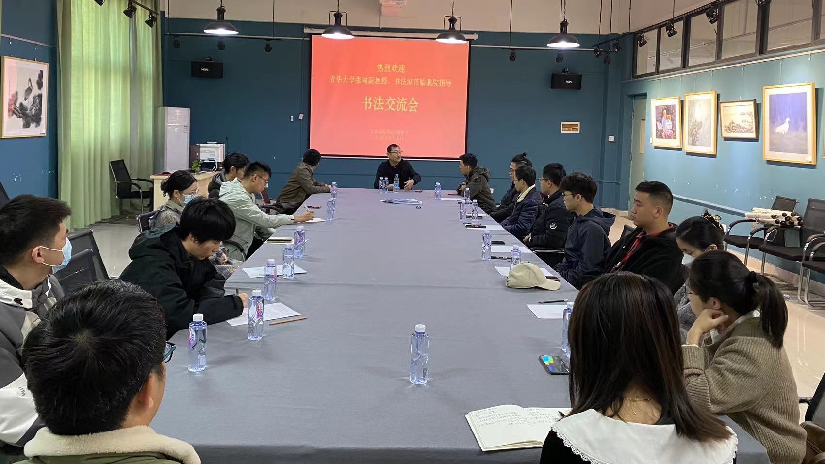 2023年2月16日上午,清华大学张树新教授、书法家莅临美术学院指导交流,美术学院副院长龚为、书法学教研室主任苏乃从及书法学教研室全体青年教师参加了此次书法交流会议。