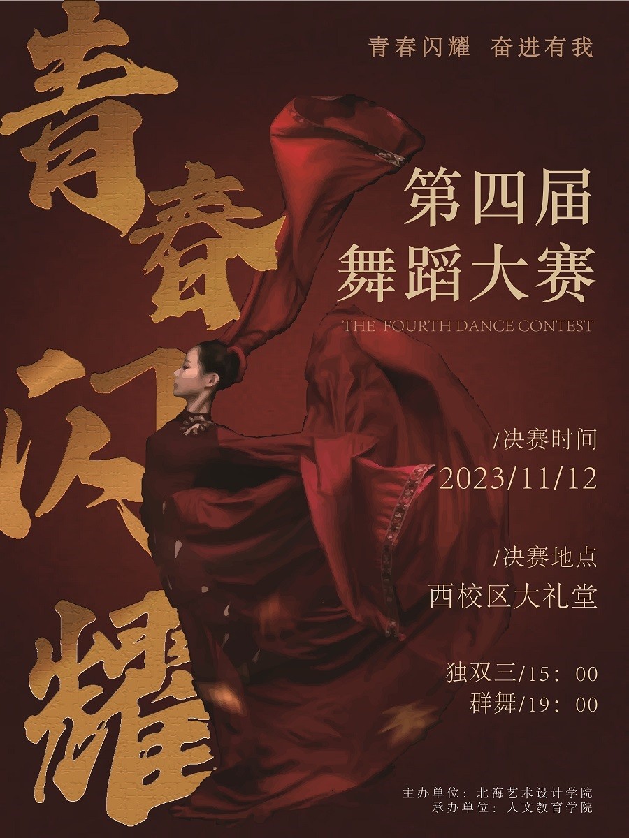 为进一步展示我校大学生的青春风采激发大学生创新意识和创作能力在优秀舞蹈作品中讲好故事、表好品质绽放青春朝气经研究,决定举办北海艺术设计学院第四届青春闪耀  奋进有我校园舞蹈大赛决赛!