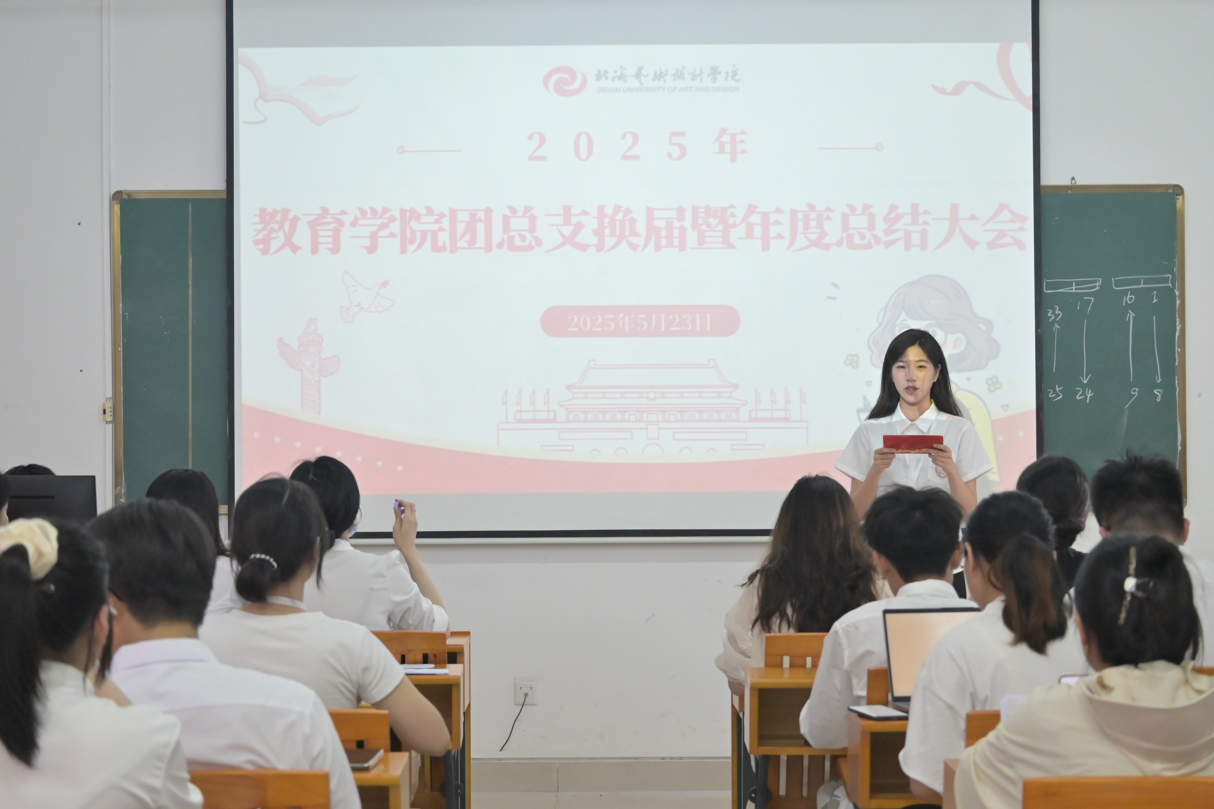 全方面总结团总支过去一年的工作成果,汲取经验,顺利推进团总支换届工作,2025年5月23日,教育学院团总支2025年换届暨年度总结大会在公德楼205隆重举行。教育学院党支部书记黄思敏,办公室主任赵阳,学前教育室主任覃思,教育学院教师黄钰婷、黄荣婷、周珊,教育学院团总支指导老师陈美霖以及团总支所有学生干部出席本次大会