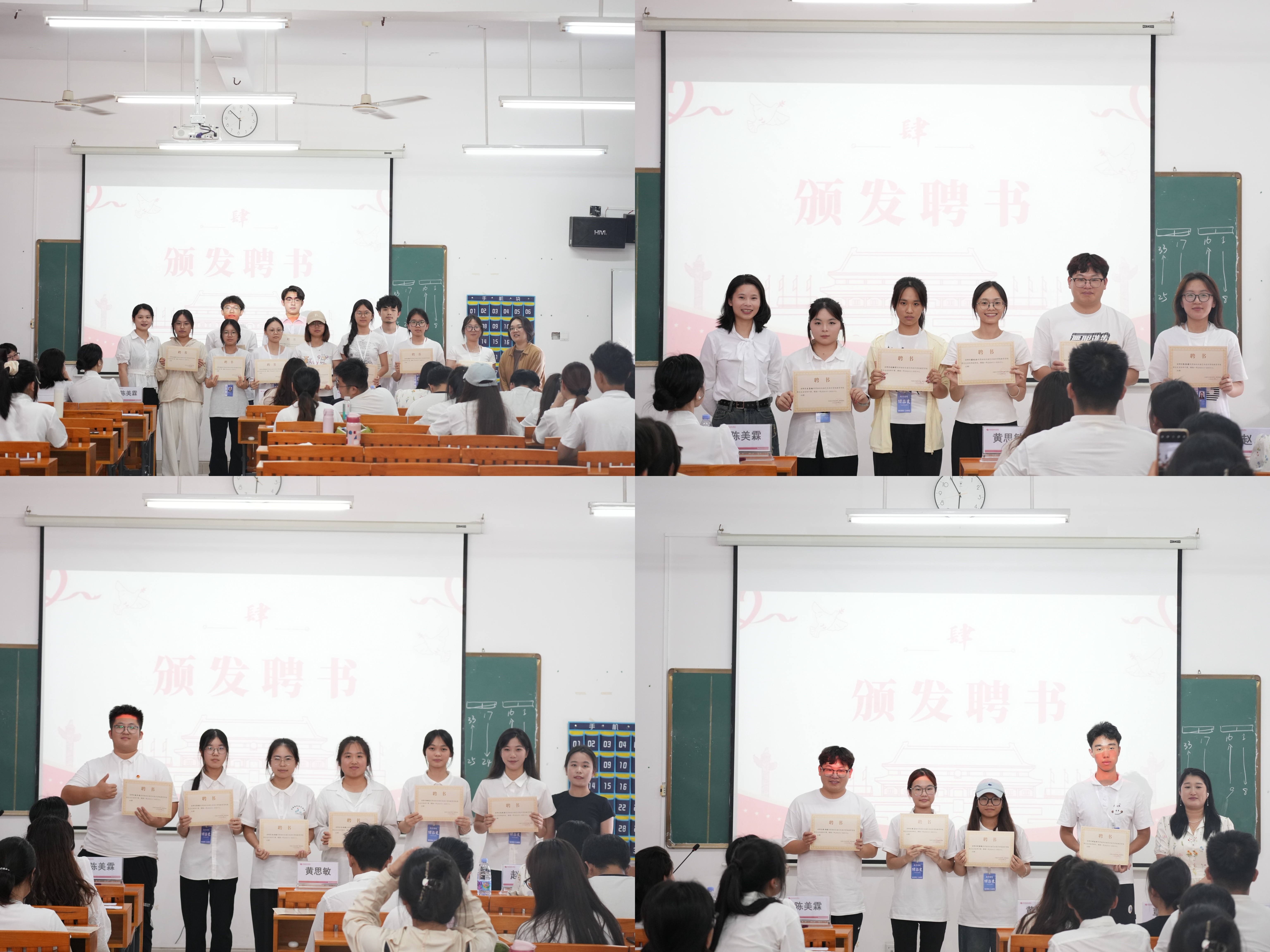 大会第项议程是为学生干部颁发聘书。各位教师代表为团总支干事颁发聘书指导老师陈美霖向表现优异的学生干部颁发2024-2025学年第二学期先进个人荣誉证书。一纸证书肯定其在本学期工作中的积极付出与出色表现,更承载着责任与信任,激励学生干部们在未来工作中继续践行初心,为团总支建设贡献力量。                                                                                教师代表给学生干部颁发聘书