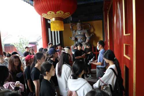 随后,师生一行前往北京民俗博物馆。这座依托东岳庙古建筑群建立的博物馆,集中展示了老北京的民俗文化与生活智慧。从传统节庆习俗、民间手工艺,到老北京的衣食住行,丰富的展品让学生们仿佛穿越时空,真切感受到民俗文化的独特魅力。学生们带着文学学习的视角主动思考,看到传统节庆相关展陈时会轻声讨论曾在文章中读到的民俗描写;观察民间手工艺品时会认真记录细节,试图将其与文学作品中的生活场景对应。这种带着学习目的的探索,让民俗文化不再是遥远的符号,而是化作了理解文学、感知生活的生动教材,也让“文学源于生活”的认知在实践中愈发清晰。