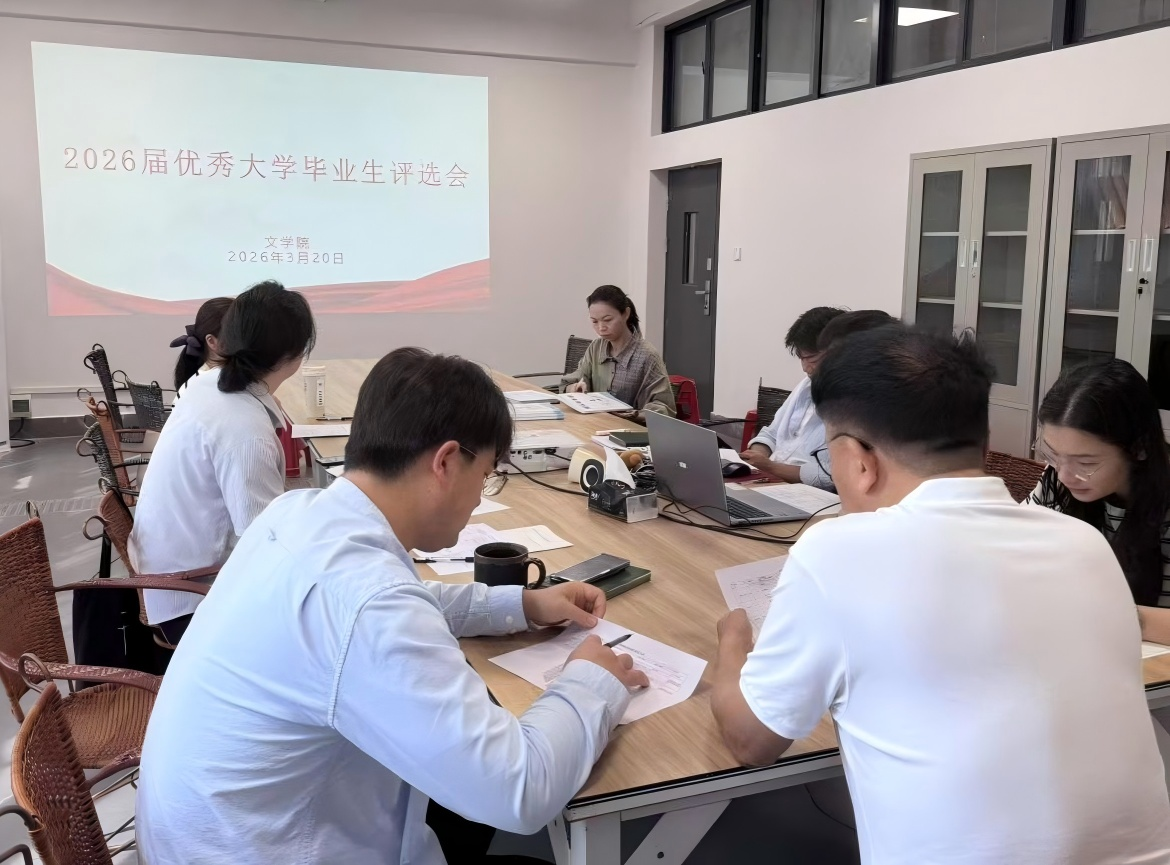 为切实做好2026届优秀大学毕业生评选工作,3月20日,文学院在南区体育馆105会议室召开2026届优秀大学毕业生评选会。此次评选小组由文学院党支部书记岳莹,副院长包瑞峰、裴景旺,学工办主任陈文斌、副主任韦亮宇等8人组成。