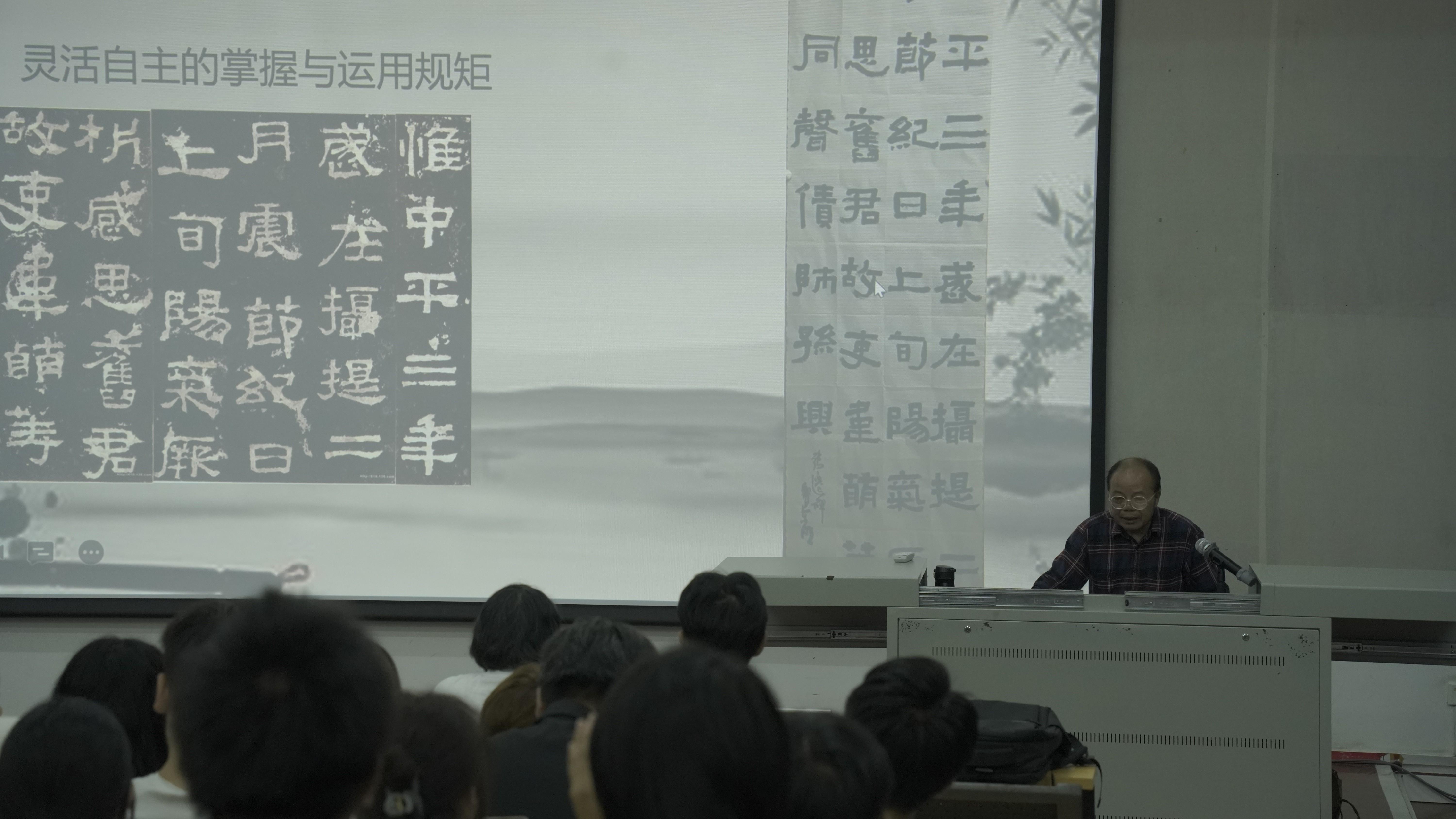 讲座伊始,黎教授以学艺经历引导同学们对中国书法学习与技术层次的思考,并分别从专业理念的认知、专业理念意义与价值的树立、专业理念在实践中的具体操作进行深入讲解。