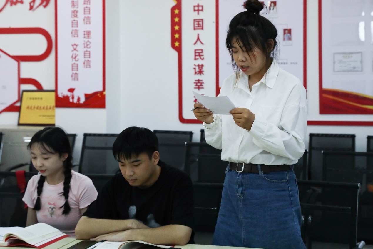 在分享自己喜欢的红色书籍阅读感受时,同学们各抒己见,气氛十分活跃。有同学分享了《红色家书》这本著作,在对这本书进行了简要概括后,她指出只有思想先破冰,行动才能后突围;新征程任重道远,新时代催人奋进。作为新时代的接班人,我们应牢记使命,在实践中进步,在发展中创新。