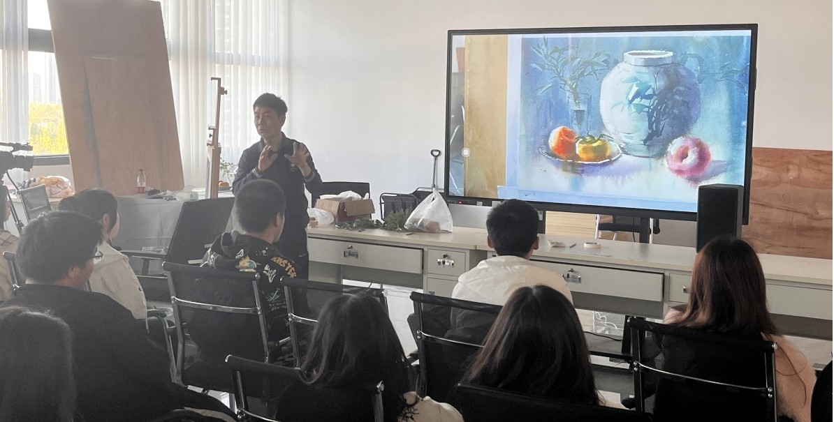 2023年11月17日,廖开教授来我院开展水彩画写生技法与表现的教学示范课。