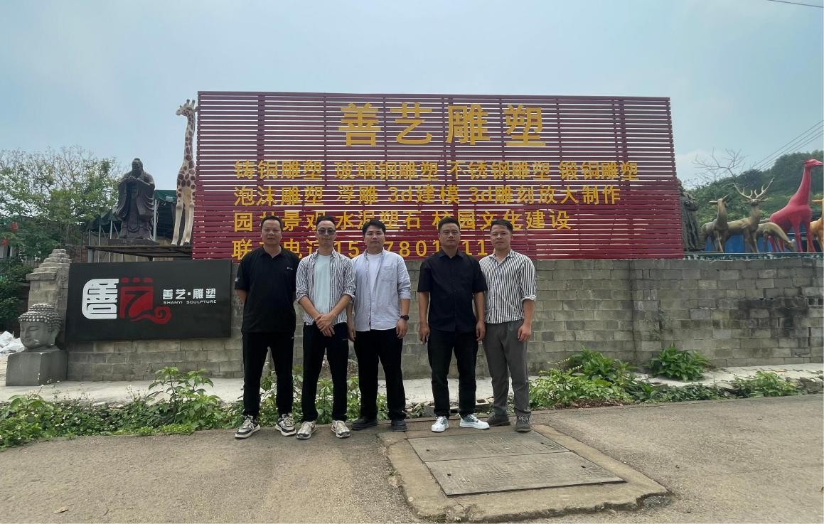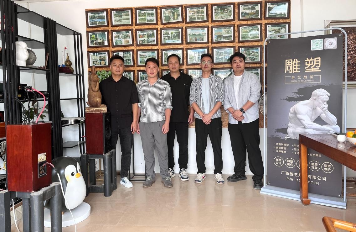 上午,考察团队首站抵达广西善艺雕塑有限公司。在公司负责人冯善良的带领下,团队深入工厂车间,实地观摩雕塑创作全流程,从原材料加工、泥稿塑形到成品精修,细致了解各环节工艺技巧及岗位技能需求。公司技术总监现场演示了传统雕刻技法与现代3D建模技术的融合应用,展现行业前沿创新趋势。