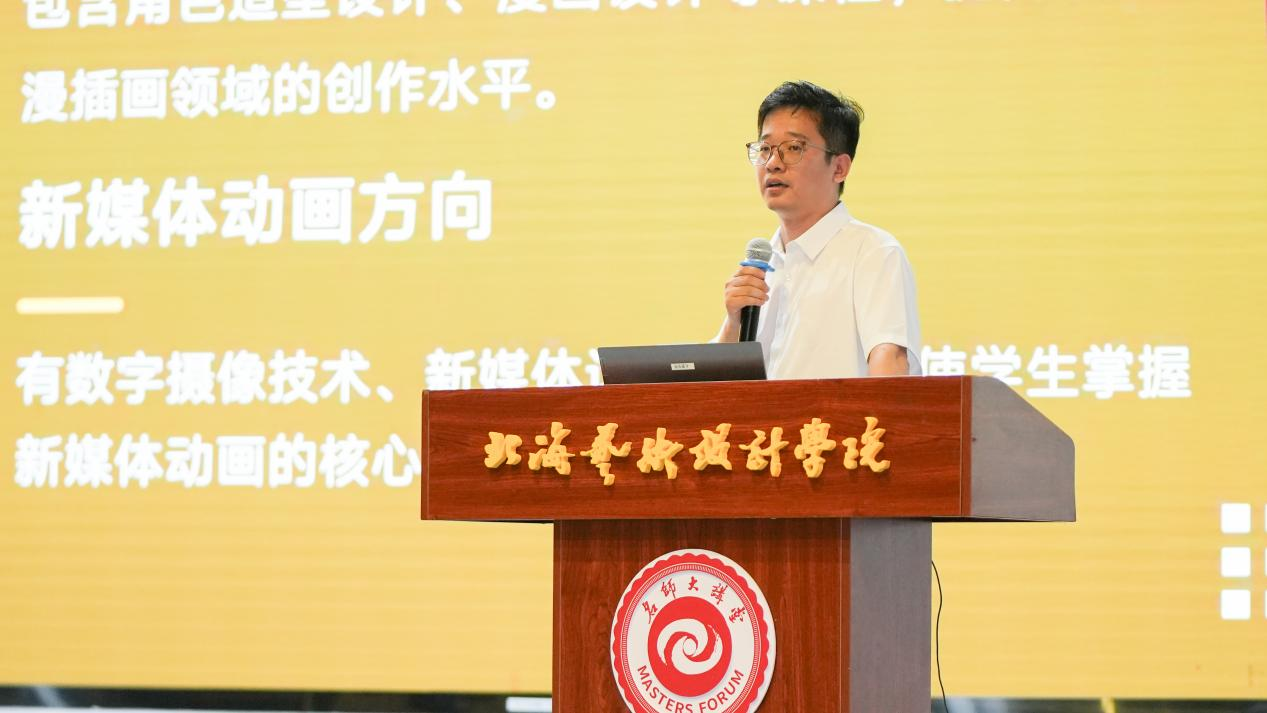 动画教研室主任于海洋从动画专业的专业架构、师资团队、成长路径、质量保障4个方面展开介绍。对基础与特色课程、毕业要求、骨干教师、培养路径和教学质量监控机制做了重点讲解。