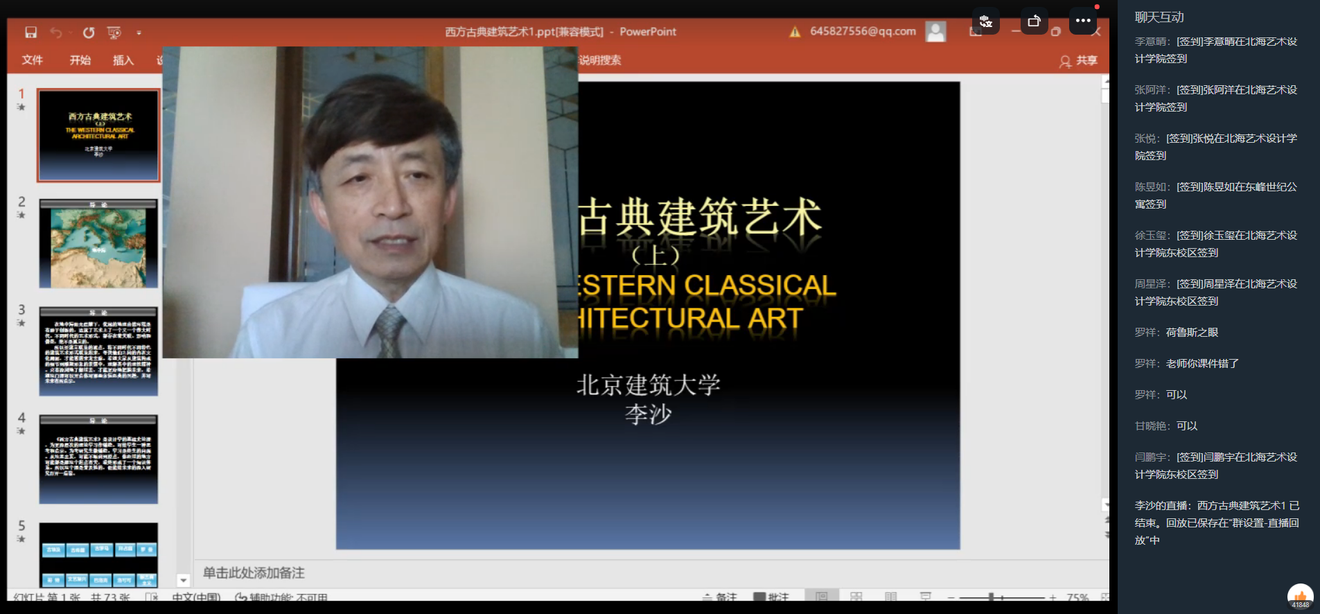 受疫情防控的影响,李莎教授采用线上直播形式为学生讲解西方古代建筑史内容,讲座主题涉及西方古典建筑发展的6个历史时期,包含古埃及、古希腊、古罗马、拜占庭、罗曼、哥特时期的建筑。讲座内容以时间发展序列和建筑风格的演变为主线,结合每个不同建筑历史时期的政治、经济等社会综合发展状况,阐述了不同建筑时期建筑风格产生的必然性及其建筑风格,使学生深刻理解建筑风格和特征的时代源头,做到知其然,也知其所以然。