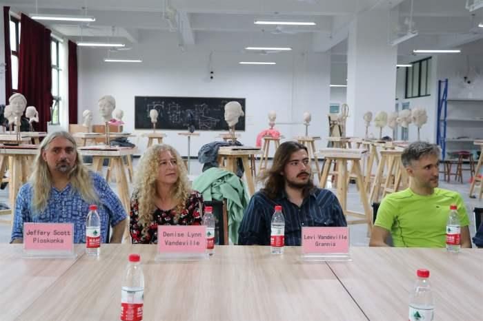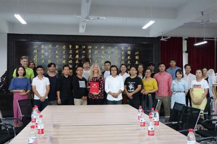 美国芬兰迪亚大学校长 DeniseL.Vandeville(丹妮丝·范德维尔)、教师 Jeffry Scott Ploskonka、教师 Levi Vandeville Grannis 等贵宾,与我校副校长胡胜、美术学院副院长成斌、美术学院副院长龚为、美术学院副院长唐海以及我校美术学院全体教师共同参与颁发聘书仪式。