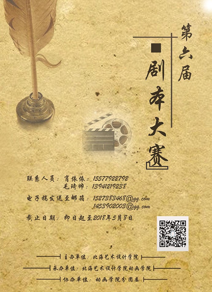 为了活跃学院学术气氛、丰富校园文化更好的促进学校发展,为今后学校的文化发展和学校组织间提供一个相互学习的机会,为各位同学提供一个相互交流的平台,促进校园的和谐,给学生们一个可以传递心意相互沟通和相互发展的渠道并相互感受校园文化的活跃气氛,我院特举办第六届北海艺术设计学院剧本大赛。