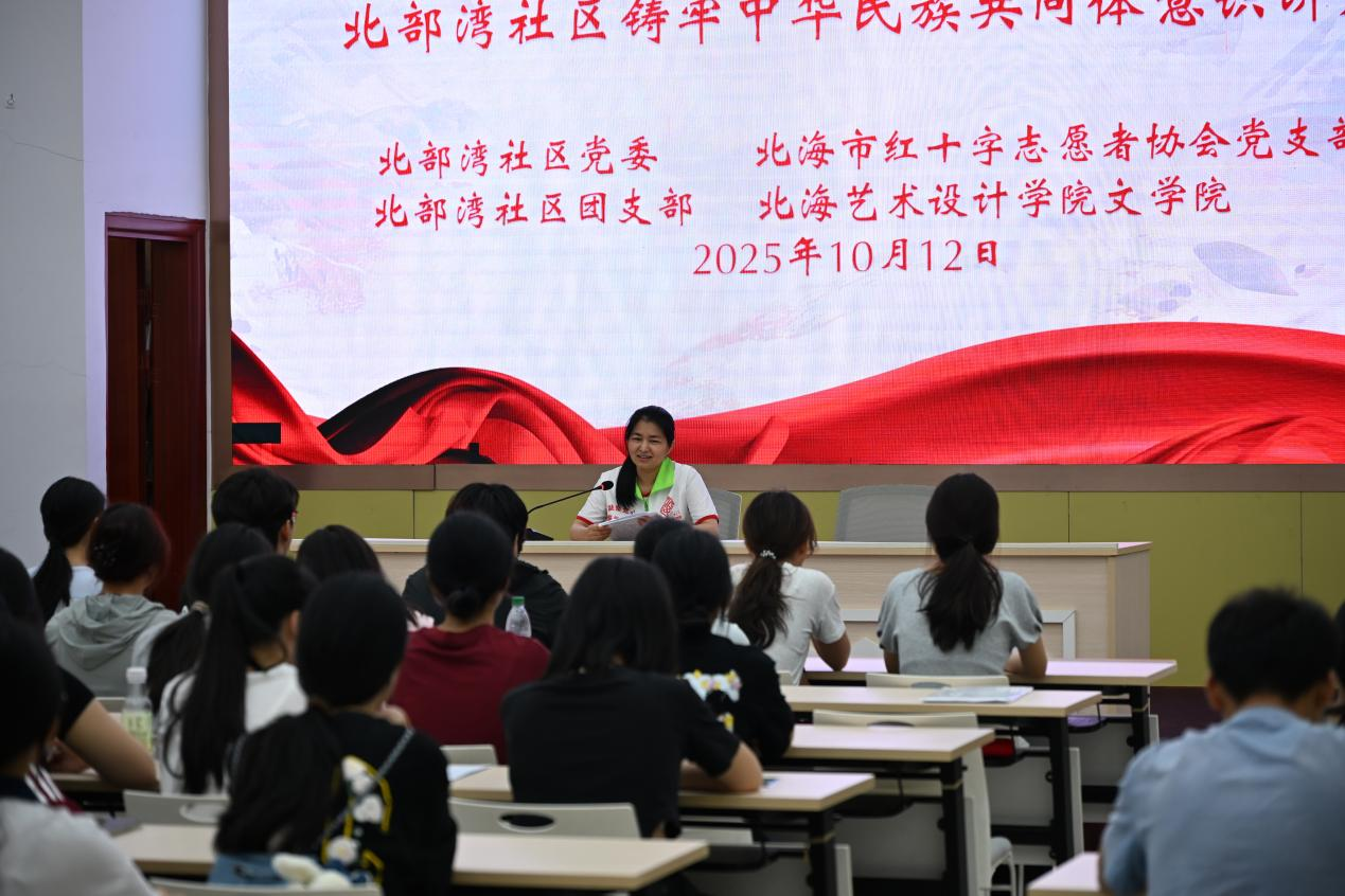 随后,北部湾社区党委书记张燕向志愿者们开展铸牢民族共同体意识讲座,张书记结合社区民族工作实际,从历史渊源、政策背景、现实意义三个维度出发,深入阐释了“中华民族一家亲,同心共筑中国梦”的深刻内涵。张书记强调,新时代青年应自觉维护民族团结大局,以实际行动促进各民族交往交流交融。她引用“石榴籽紧紧抱在一起”的比喻,形象说明五十六个民族如同一粒粒石榴籽,只有紧密团结,才能共同绘就中华儿女的大美同心圆。
