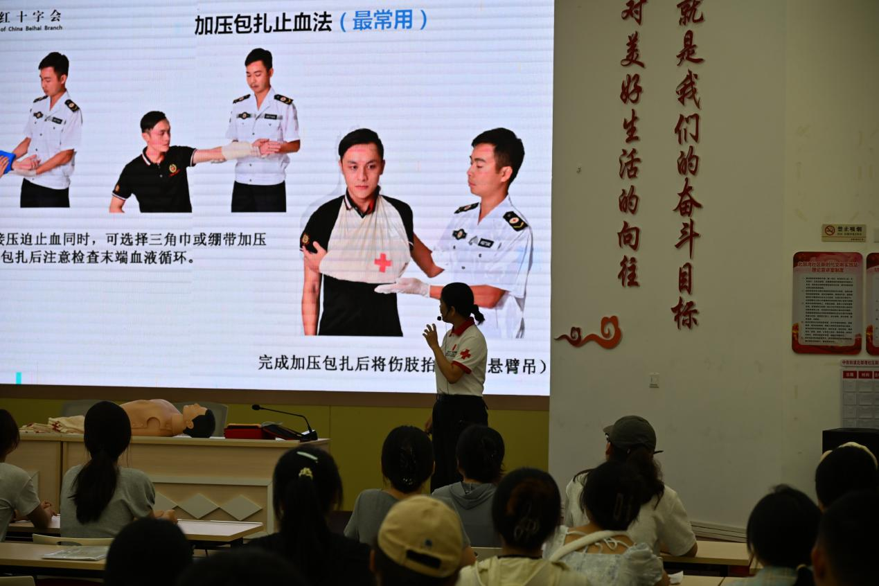 紧接着,北海市红十字会林老师向志愿者们讲授应急救护培训,培训涵盖了海姆立克急救法、昏厥与癫痫发作的现场处理、创伤包扎、心肺复苏以及AED的使用方法等多个实用模块。