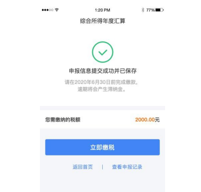 若您收入不足 12 万元且有应补税额,或者收入超出 12 万元但应补税额≤400 元,申报提交后无需缴款。