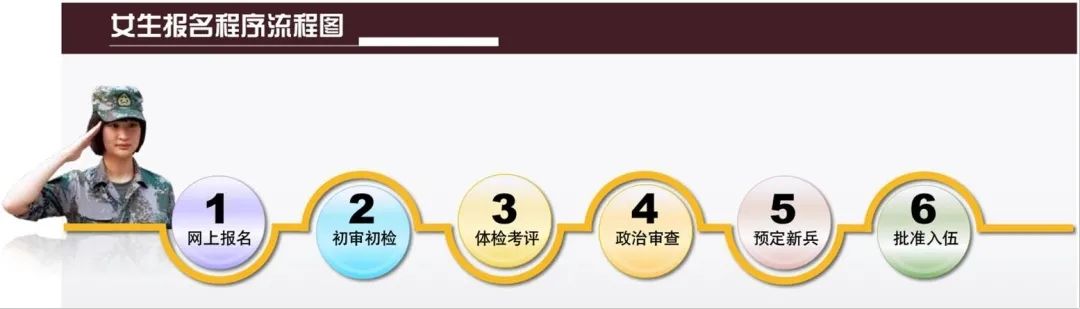 审定新兵:对体检、政治考核合格的女青年,按照综合素质考评分数由高到低的顺序,依次确定新兵对象,经不少于5天公示合格后批准入伍。