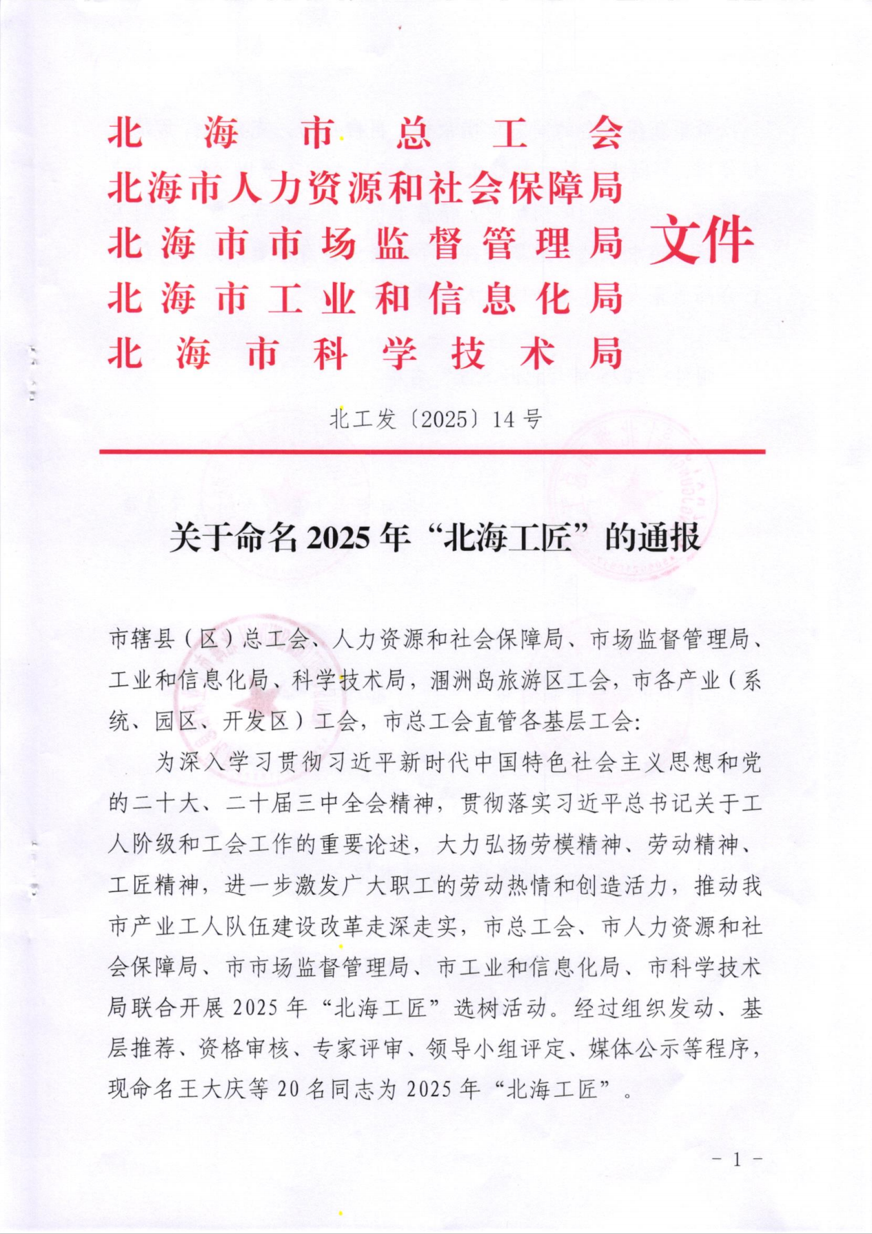 喜报丨我校教师获评2025年“北海工匠”荣誉称号